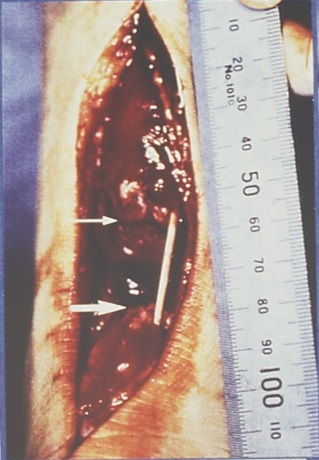 治療は手術療法と保存療法(非手術)に大別されます。基本的には治療期間に大差はなく、筆者は保存療法によるオリンピック代表選手の完全復帰例を経験しています。 手術療法:断裂したアキレス腱を直視下で確認しつつ(写真3)、縫合糸にて断裂部を縫合し、術後はギプスで固定を行います。ギプスの固定期間は手術法で4~6週(シーネ含む)、保存療法で6週を要します。ギプス固定後は約1ヶ月間装具を用いて歩行します。 保存療法:受傷時は断裂した腱の接近を目的として、足関節最大底屈位(50度以上)にして膝下からのギプス固定を行います(写真4)。荷重はフロアタッチ程度で、ギプス固定下でも下肢の屈伸運動は許可します。2週間経過した受傷後3週目で足関節約30度底屈位の固定に変更し、荷重は軽度の部分荷重とします。 受傷後5週目から足関節軽度底屈位で、ヒール付きギプス固定として全荷重歩行を行います。受傷7週より約1ヵ月間は短下肢装具を使用し、足関節の自動運動訓練を開始します。受傷11週目より装具をはずします。