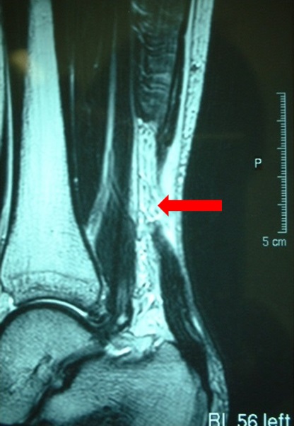 写真2 MRIによるアキレス腱断裂状態(矢印)