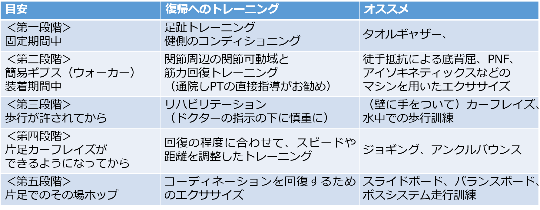 両治療法共に装具が取れたら両足つま先立ち練習や軽いジョギングを行います。ダッシュなど受傷原因となった動作は最も注意すべきであり、リハビリテーションの最終段階で行ないます。
