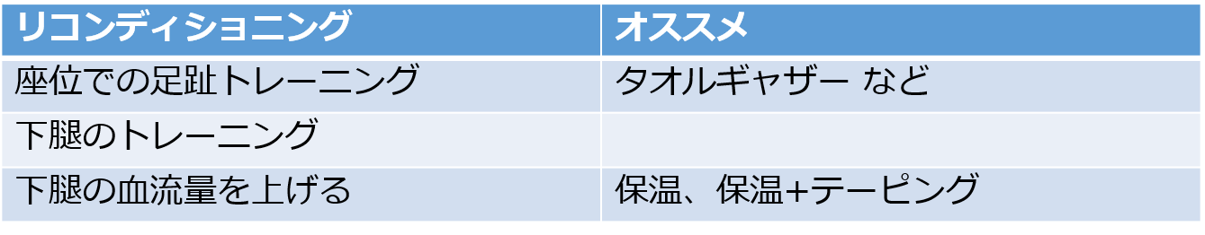 ・下腿の前面と後面の筋肉群の静的ストレッチ、マッサージやアイシングなどのアフターケア