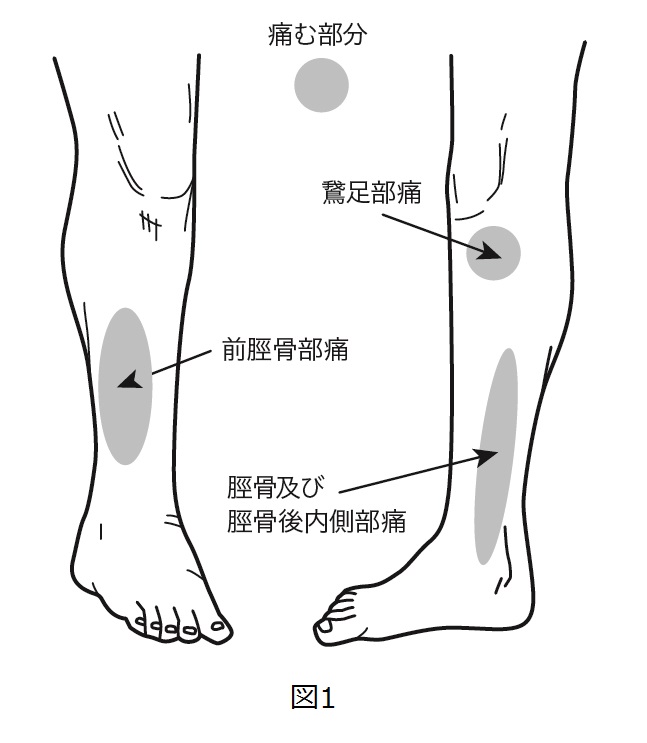 徐々に発生する下腿内側(主に脛骨内縁中1/3、目安として脛骨内踝より12~20cm上)の圧痛、運動時痛、腫張が主症状で、足屈筋の抵抗運動で痛みは増強します。