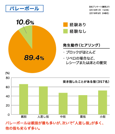 バレーボール・バスケットボールでの突き指の経験有無と、どの指を突き指したかを自社アンケートにより調査いたしました。バレーボールは「親指」が最も多く、次いで「人差し指」が多いですが、他の指も劣らず突き指の経験者が多い結果となりました。