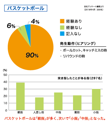 バスケットボールは、ボールカット、キャッチミス、リバウンドの際に突き指をした経験者が多く、「親指」が最も多い結果となり、次いで「小指」「中指」で突き指の経験者が多い結果に。この調査より、多くの人が突き指を経験しており、「複数の指」を経験している人が多いことがわかりました。