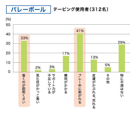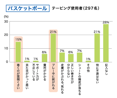 突き指の予防やケアにテーピングを使用する方も多いですが、テーピングに対する不満を調査したところ、「巻くのが面倒」、「プレー中に剥がれる」という不満が多く、次いで「費用がかかる」、「皮膚かぶれ」が多いこともわかりました。