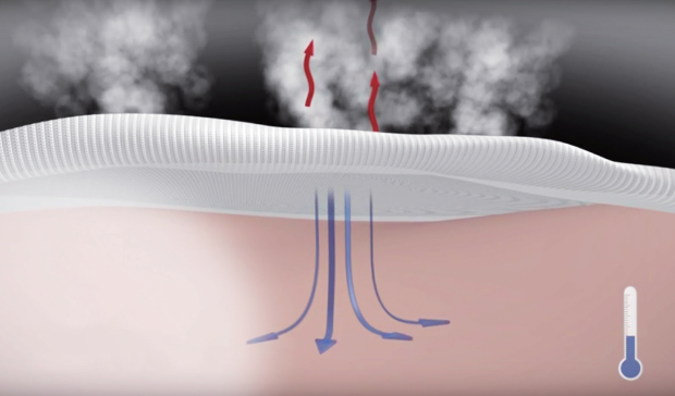 HeiQ Smart Tempで加工された生地が高い温度と水分によって気化冷却作用を起こします。