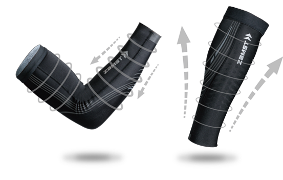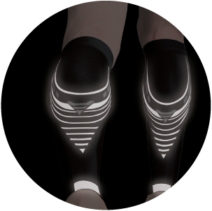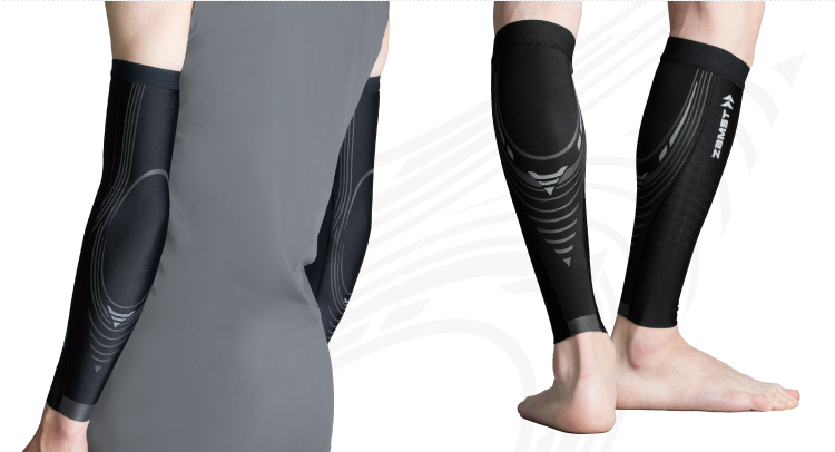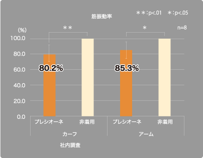 該当部位に加速度計をとりつけ、筋振動の度合いをプレシオーネの非着用と比較。ヒールタップ時(カーフ)/他動的振動時(アーム)カーフスリーブで約20%、アームスリーブで約15%振動を抑制することを確認。