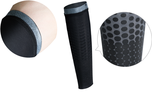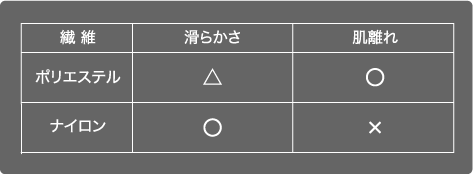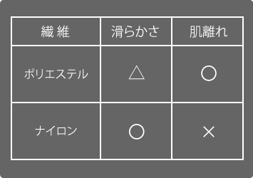 『ポリエステル』を採用。可能な限り細い糸を採用し、滑らかさを実現。『ナイロン』よりも水分率が低く、汗のベタつきなどが軽減されます。