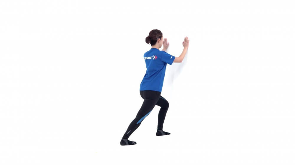 写真6 低い姿勢で壁を押す。このときふくらはぎが伸びて、足関節が背屈しアキレス腱が伸びる状態を意識する。ラグビーのスクラムの姿勢が好例。