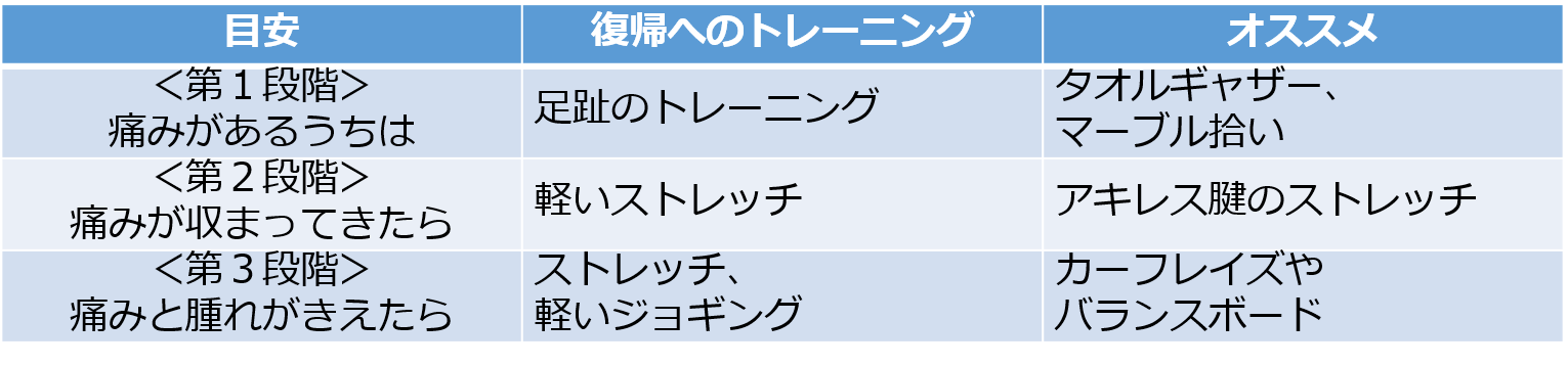 3度の損傷などで手術適用となった場合には、初期のリハビリテーションは病院で理学療法士の指示下で行います。関節可動域や筋の機能回復などが主な目的です。病院に行かなかった場合でも、安静期間後は必ず柔軟性や筋力、バランス(関節の安定性を含む)などを獲得するためのリコンディショニングを行います。メディカル編でも触れているように、特にアキレス腱の柔軟性は、足関節捻挫と密接な関係がありますので、ストレッチングはしっかりと行ってください。