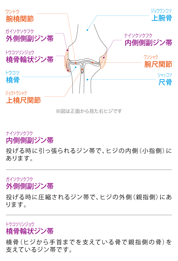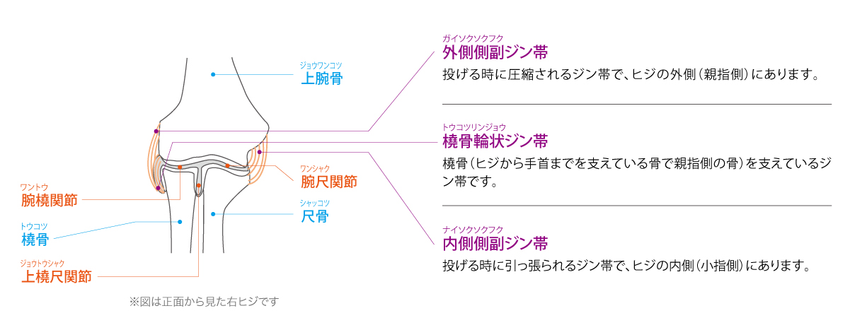 そんなヒジはそれぞれ3つずつの骨とジン帯と関節で構成され、筋肉と連動して複雑な動きを可能にしています。