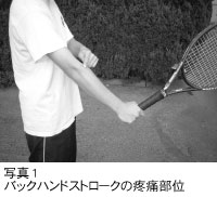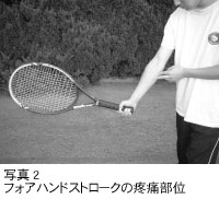 上級者より初中級者のほうが罹患しやすく、障害=テクニックの未熟を反映しています。使いすぎによる症状ですが、親指側の肘外側が痛むタイプ(バックハンドストローク/写真1)と小指側の肘内側が痛むタイプ(フォアハンドストローク/写真2)とに分かれます。誘因として、ラケットの質(衝撃吸収性の良否)やガットの硬さ、またこれらが破損していて、衝撃吸収が悪い場合などが考えられます。