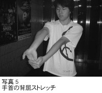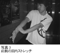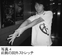 対処法は第1に練習前後のストレッチングが挙げられます。肘だけでなく、肩から手首や指までの屈伸、前腕の回旋ストレッチが有用です。具体的には右肘を伸展位にて前腕の回内(写真3)、回外(写真4)は左手で抵抗をかけて右手を牽引しつつ行うと、手→肘→肩までストレッチされます。手首の背屈ストレッチも有用です(写真5)。