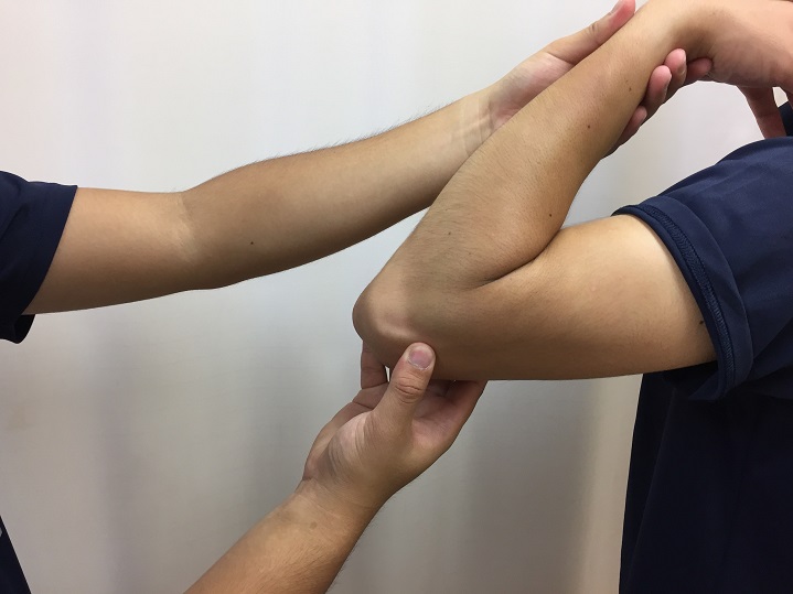 肘になんらかの問題があれば可動域制限となって表れます。伸展と屈曲動作をチェックします。また、手関節屈筋群の牽引ストレスが内側痛の、伸筋群の牽引ストレスが外側痛の原因となるため、手関節屈曲(底屈)と手関節伸展(背屈)の可動域制限もチェックします。可動域は約90度あれば問題ありません。