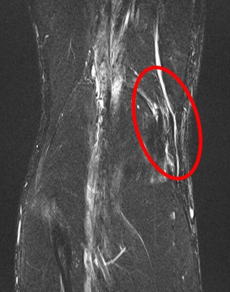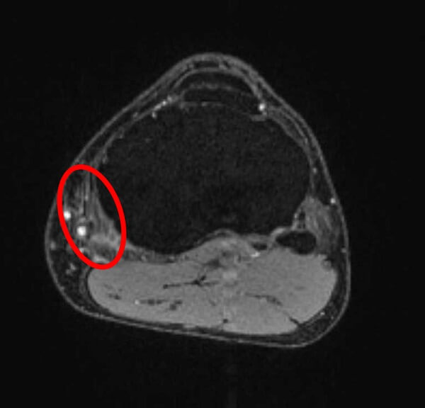 鵞足の腱周囲の炎症による輝度上昇(白く見える)が確認できる。