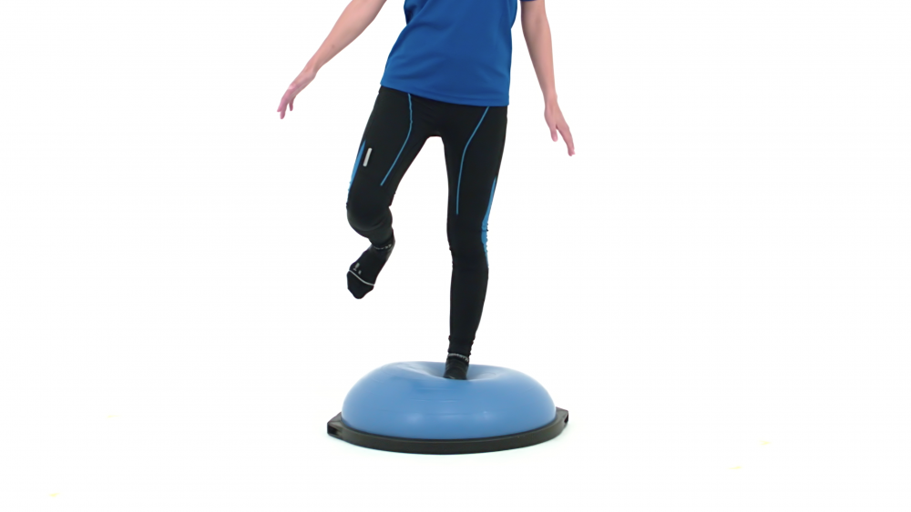 BOSUシステム上での片脚立ち訓練などでは、膝関節周囲筋の協調性獲得を目的としています。
