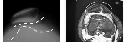左:レントゲン像(軸写):膝蓋骨は亜脱臼して外側に変化している。関節の適合性悪し