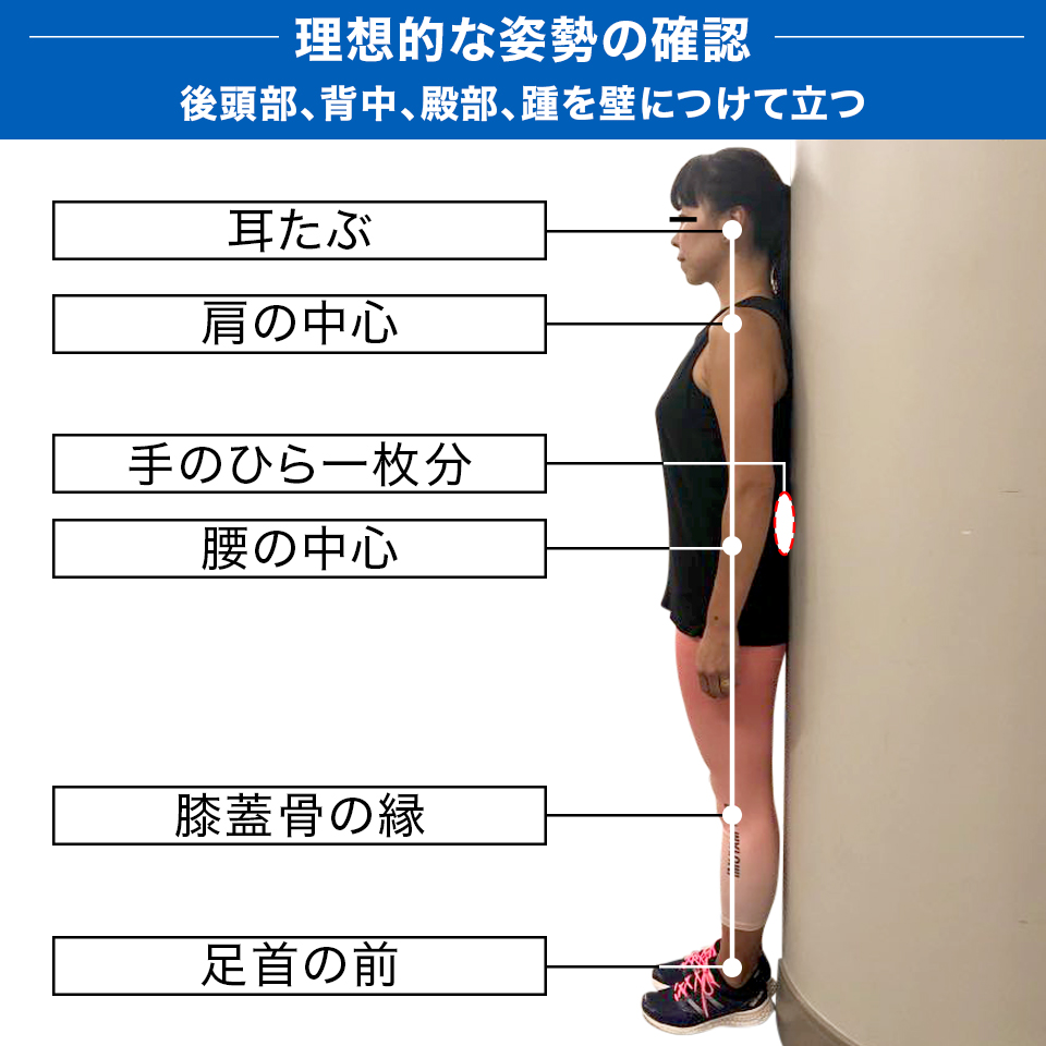 正しい姿勢は、壁に背中をつけて確認することができます。踵、殿部、肩、後頭部を壁につけて立ち、腰に手のひらが一枚入るくらいの姿勢が余分な負担をかけずに活動できる姿勢です。胸の筋肉や太ももの前、裏の筋肉、股関節の筋肉の柔軟性が低いと正しい姿勢を維持することができませんので、ストレッチングを習慣化させてください。また腹筋など体幹部の筋力向上も膝関節への負担を軽減させてくれます。ストレッチングと合わせて腹筋をはじめとした体幹部のトレーニングも行ってみてください。