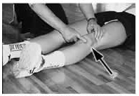 写真 中学生強化選手のメディカルチェックにおいて、膝蓋骨下極の典型的圧痛部を認めた