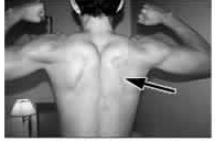 写真 バレーボールチームの右利きエースアタッカー。メディカルチェックにて右肩関節外旋筋力低下。肩甲骨神経麻痺による棘下筋萎縮が判明。