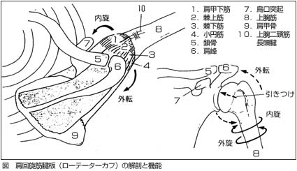 肩関節は、解剖学的特徴から、いろいろな方向によく動きます。逆に、安定性のない関節、ということもできます。そんな不安定な関節を頑張って安定させているのが、「ローテーターカフ」(回旋筋腱板)と呼ばれている筋肉群です。