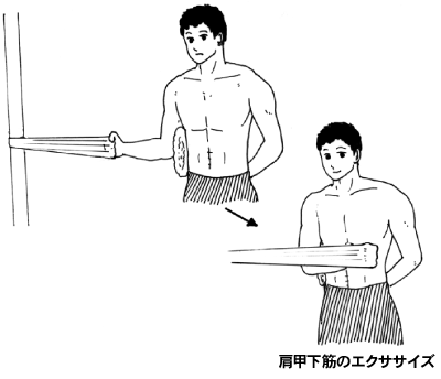 ローテーターカフを選択的にトレーニングするには、大筋群をなるべく収縮させずに行うことがポイントです。そのために、負荷の軽いチューブやダンベル(1~3kg)を用います。回数は20~30回×3~4セット、毎日行います。また、水中で内旋、外旋を繰り返す方法も効果があります。