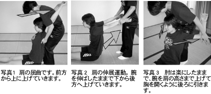 ストレッチングの例をいくつかご紹介します。一般的な肩のストレッチングです。写真1~3をご参照ください。