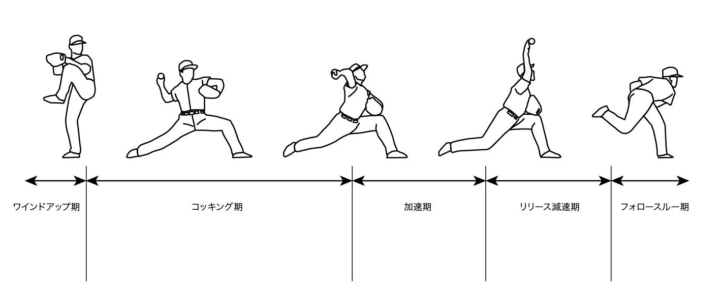 野球の投球動作は、ワインドアップ期、コッキング期、加速期、リリース減速期、フォロースルー期の5相に大別され、それぞれの期において受傷原因が異なります。