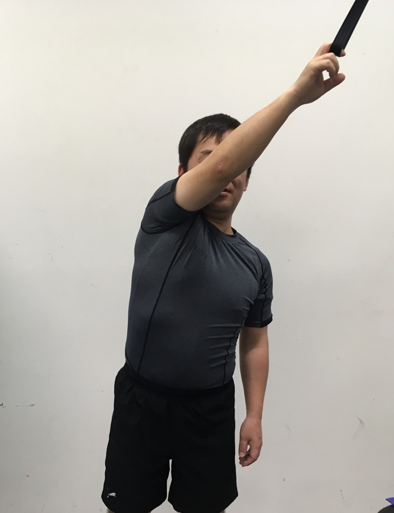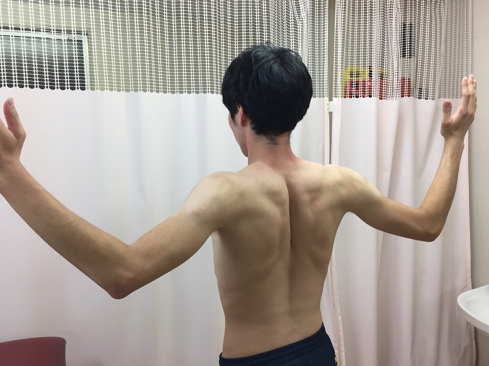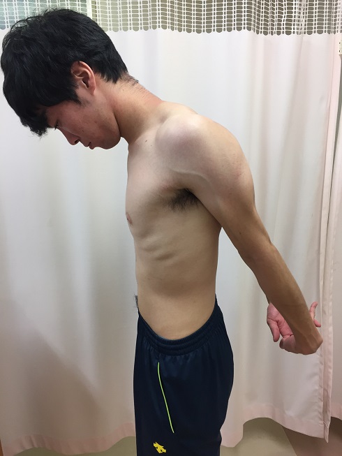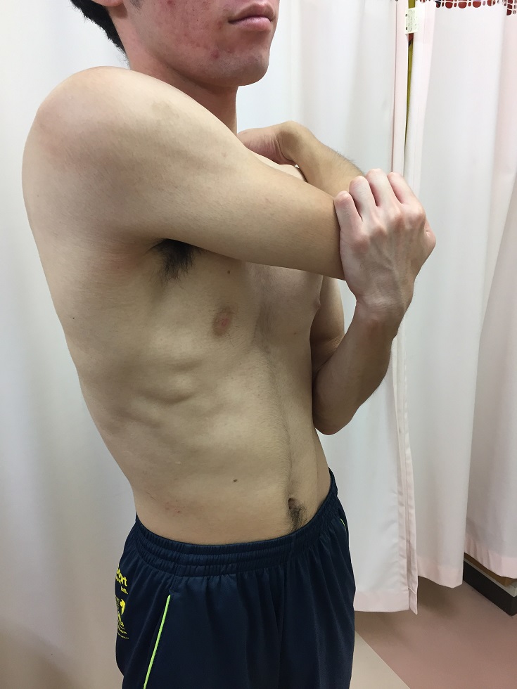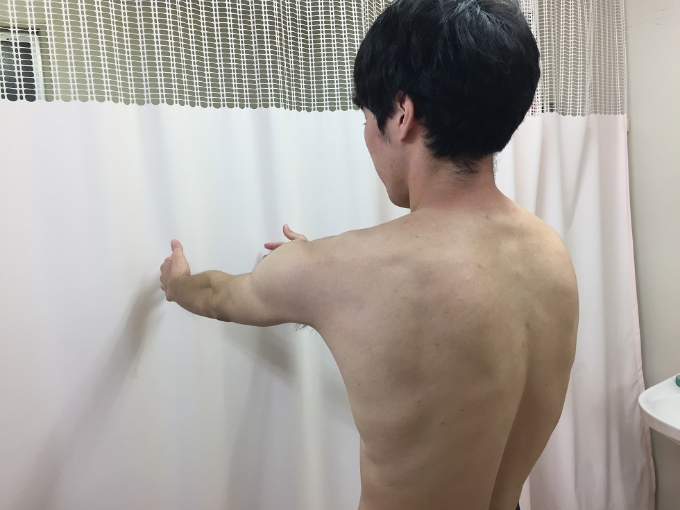腕は体の後ろで肩の外転・外旋が強調されて、肩後方の三角筋、棘上筋、棘下筋、小円筋が収縮し、前方関節包や肩甲下筋は引き伸ばされて肩前面痛の原因となります。