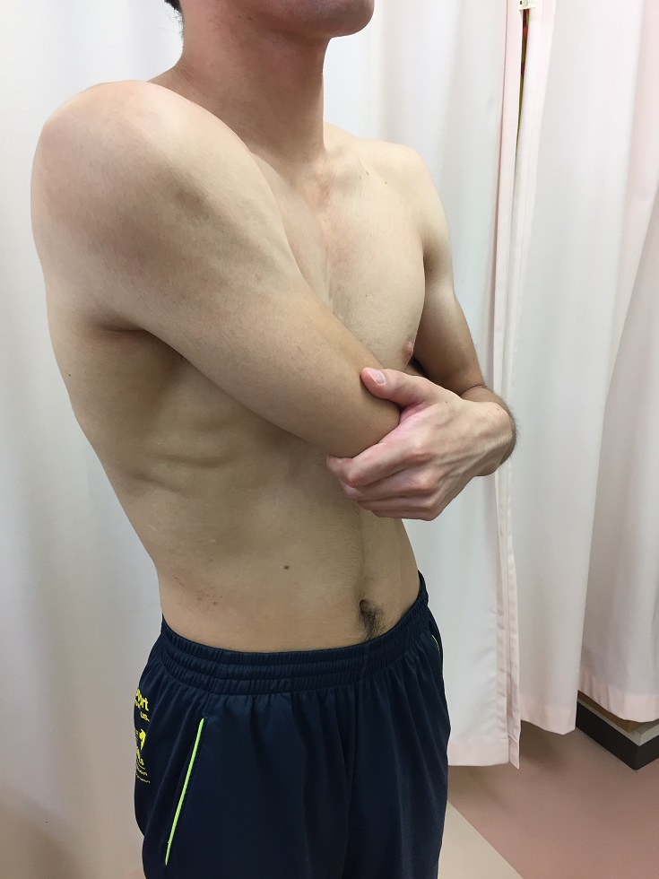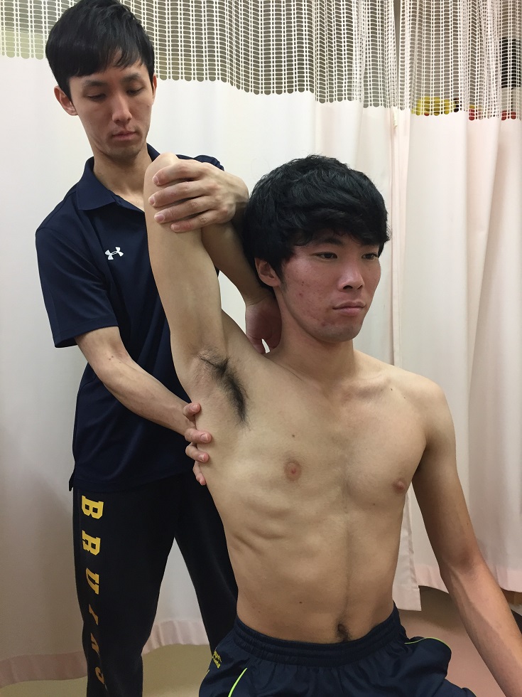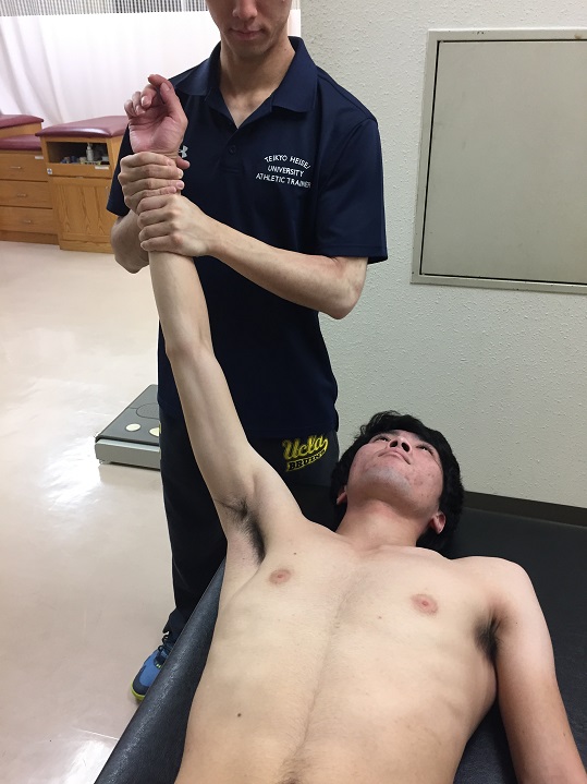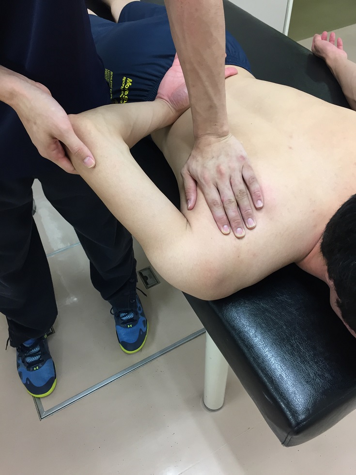 トレーナーは、肩甲骨内側縁を固定する一方で、選手の肘を上から下へ軽く押していく