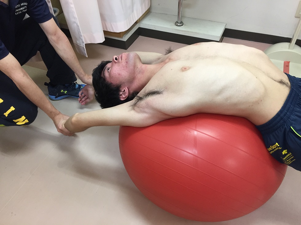 バランスボールなどを利用し、大胸筋、腹筋などの体幹部を伸展させながら同時に肩関節全面をストレッチする