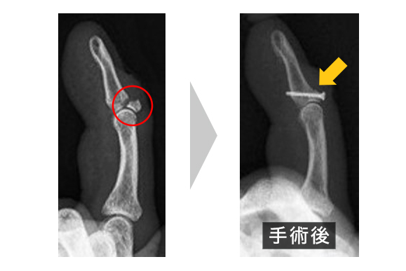 伸筋腱の付着部骨折(赤丸部分)により、受傷指を伸展することができなくなった例です。
