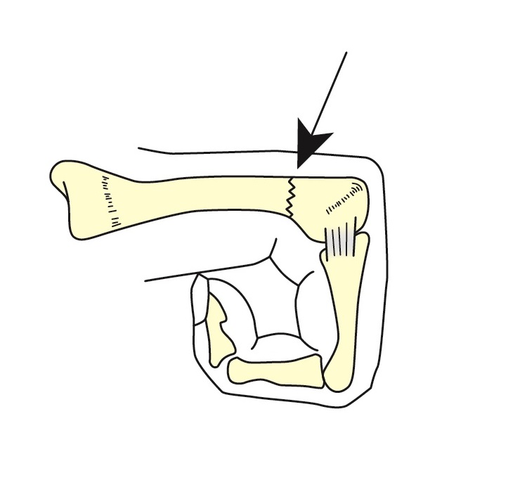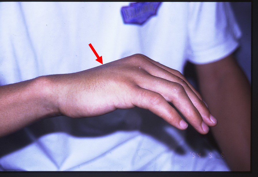 中手骨の頸部に骨折線があり、背側突の屈曲変形を呈します(写真2)。この変形は、骨間筋、指屈筋腱、手根伸筋などの作用で骨が転位したため引き起こされます。
