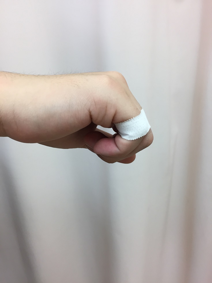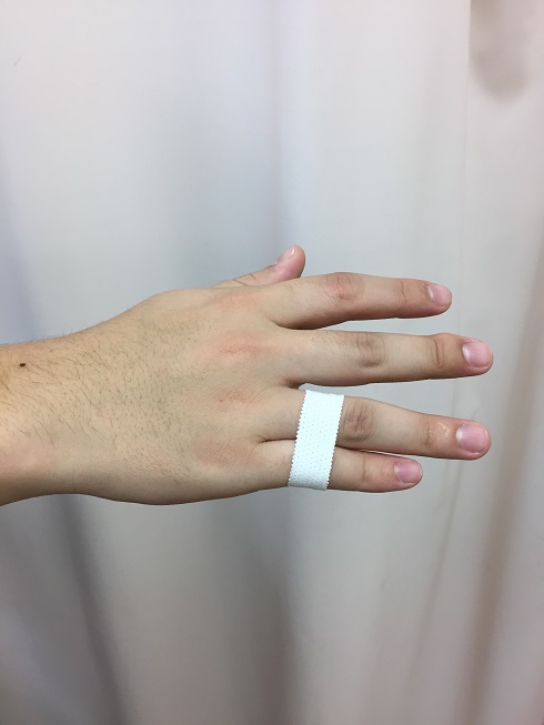 掌側にアルフェンスシーネを当てて、手関節部とDIP関節の辺りでテープで固定します(写真3)。MP関節は、やや屈曲位で固定します。 固定をしたら、すみやかに医療機関を受診しましょう。
