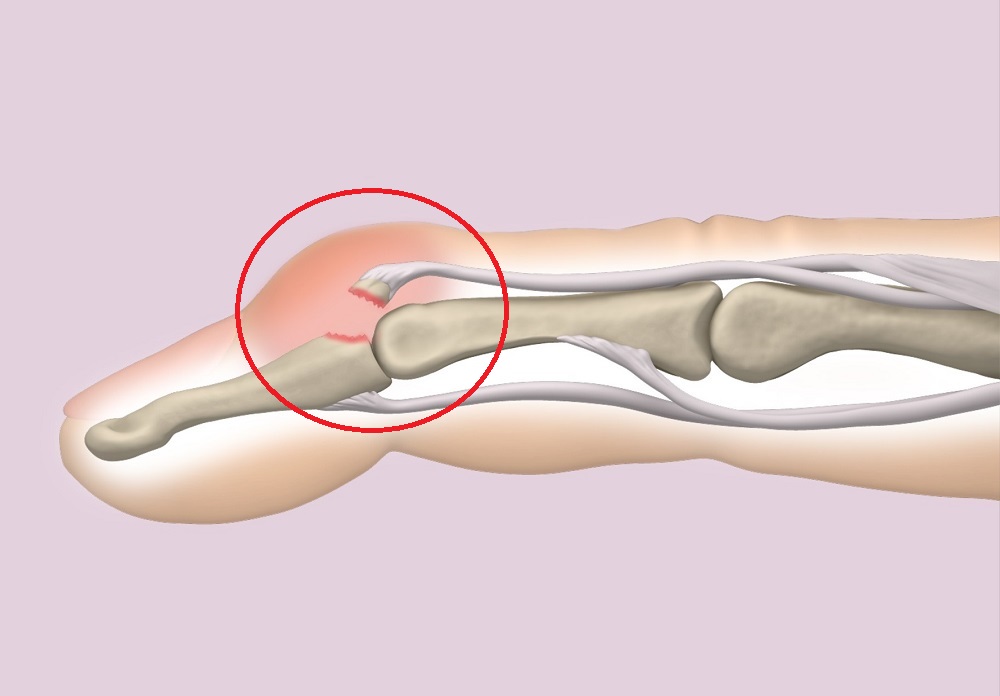 指のDIP関節(一般的にいう第1関節)が曲がって完全伸展できない変形をマレット指といいます。指伸展位で指先(主につめ側)にボールが当たるなどしてDIP関節に屈曲方向のストレスが加わったときに、末節骨に付着している伸筋腱が断裂したり(図)、ときに剥離骨折を伴ったり、指の変形(マレット変形)や可動域制限(完全伸展不可能)をきたしたりします。