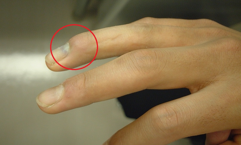 指のDIP関節部での疼痛、腫張、発赤、熱感などが主症状で、剥離骨折を伴う場合は軽度の圧痛や典型的な変形が生じます(写真1)。このような場合には必ず医療機関を受診してください。