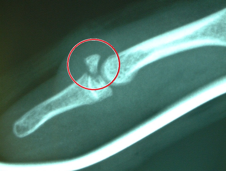 捻挫や靱帯損傷の症状と剥離骨折の症状とは類似しているので鑑別診断は難しく、レントゲンチェック(写真2)が必要です。