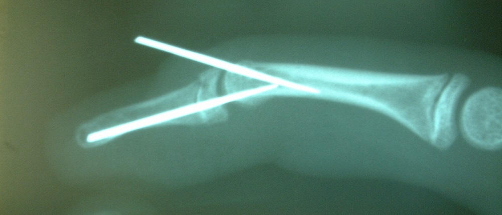 スプリント(副木)で指のDIP関節部を過伸展位にし、6週間固定します。剥離骨片が大きい場合には、手術をして整復固定を行います(写真3)。