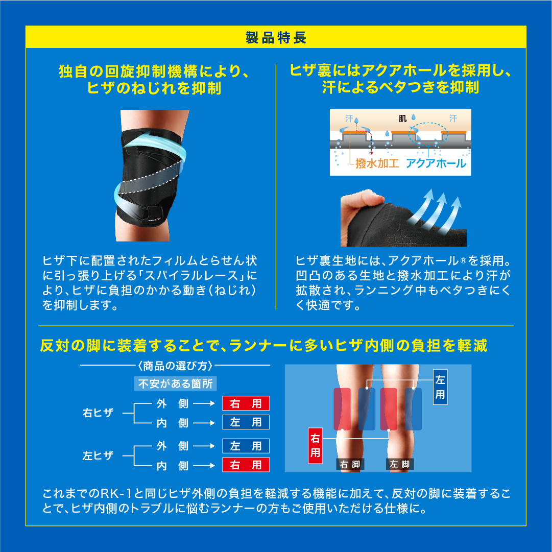 これまでのRK-1と同じヒザ外側のふたんを軽減する機能に加えて、反対の脚に装着することで、ヒザ内側のトラブルに悩むランナーにもご使用いただける仕様に。