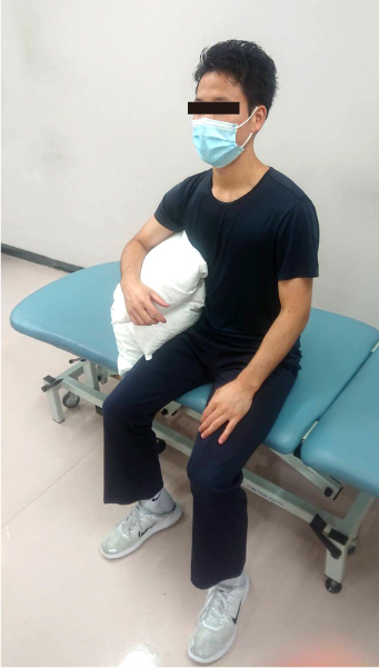 肘を曲げた腕をやや上げて前に出し(①軽度前方挙上)、肘をやや外側に向けて(②軽度外転)、手首は軽く外側にまわします(③軽度外旋)。