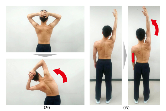体幹の動きをよくする運動(左)をすることで、すぐに拳上することが容易になります(右)。