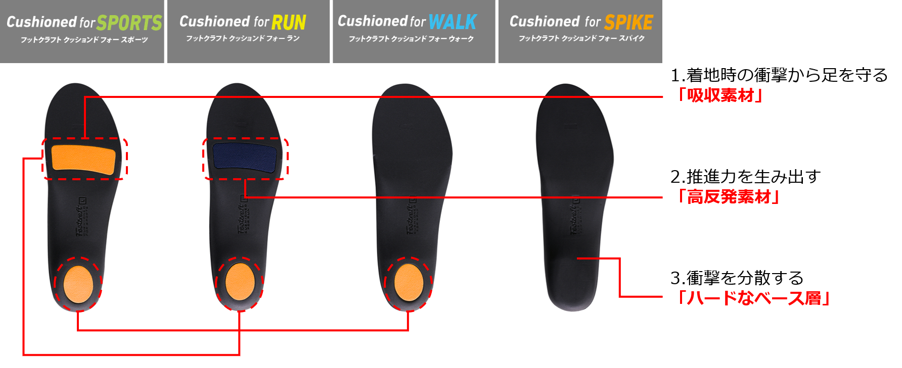 2017年に発売したザムスト初のファンクショナル(機能性)インソール「Footcraft(フットクラフト)」の第4弾として、優れた衝撃対策※性能(吸収・反発・分散)を備えた「Footcraft Cushioned(フットクラフト クッションド)」、4タイプを新たに発売いたします。